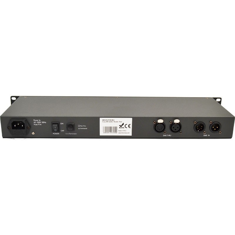 Der DMX4R-2 Splitter fungiert als Signalverteiler und -verstärker. Er verfügt über einen Eingang und vier DMX-Ausgänge, jeweils ausgestattet mit 3- oder 5-poligen XLR-Anschlüssen für Kompatibilität mit jeder DMX-Konfiguration und 100%ige elektrische Trennung zwischen allen Ein- und Ausgängen. Er verfügt über LED-Signal- und Betriebsanzeigen auf der Vorderseite für jeden Ausgang, sehr hilfreich bei der Fehlererkennung.