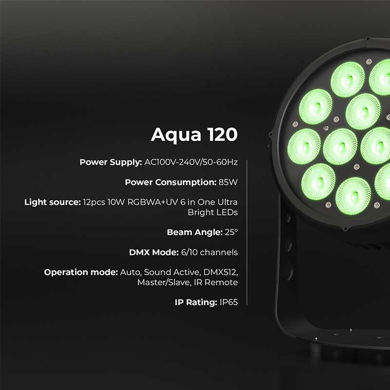 Der Triton Blue Aqua 120 ist ein leistungsstarker LED-PAR-Scheinwerfer für Outdoor-Events. Mit 12 × 10 W RGBWA+UV-LEDs, satten Farben und IP65-Schutz liefert er brillante Effekte bei Events, Architektur- und Bühnenbeleuchtung. Dank flickerfreier Steuerung, DMX512/RDM und robustem Aluminiumgehäuse ist er die zuverlässige Wahl für Profis in Eventtechnik und Festinstallation.