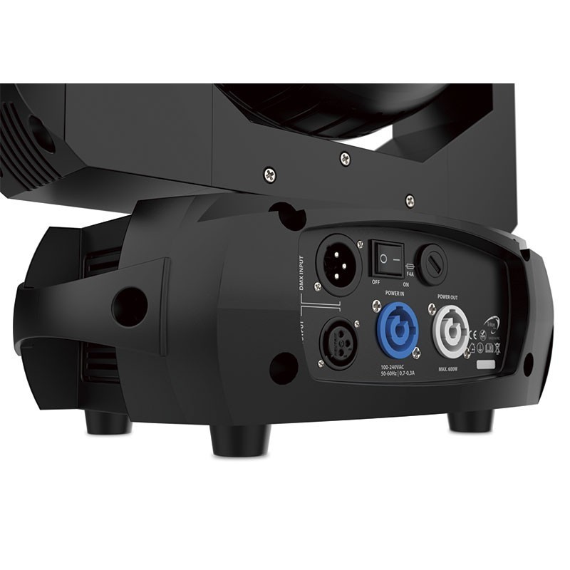 - Gobos: 1 × Rad mit 8 festen Gobos + Weiß, 1 × Rad mit 7 rotierenden Gobos (20 mm Außendurchmesser, 18 mm Bildbereich)
